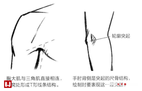胸大肌与三角肌相连接,在腋窝处会产生T形结构(如下图左所示),绘制时要注意手肘背侧是突起的结构(如下图右所示)。