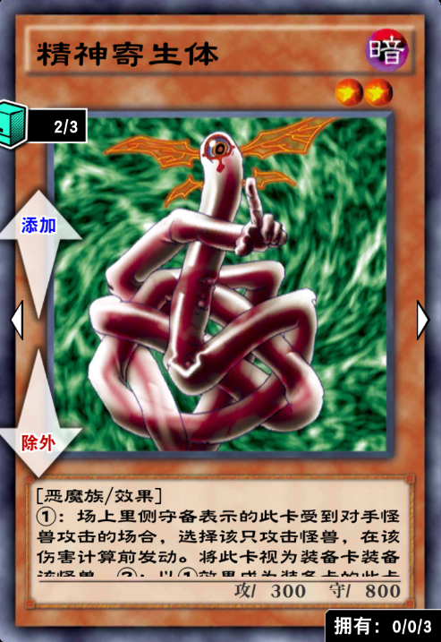 因为这套卡组是一套主打血量的卡组,所以在构筑方面我们选择的怪兽也是精神寄生体以及迷走魔鬼这样的补充血量的怪兽。精神寄生体拥有在里侧表示被攻击的场合装备在该怪兽身上的效果,每回合开始阶段可以稳定回复其一半攻击力的生命值。而迷走魔鬼这张卡则是在被战斗破坏送去墓地的时候可以让双方回复800的生命值,因为我们并不是靠伤害打死对手,所以给对手回复生命值也是完全没有问题的。