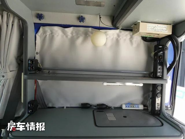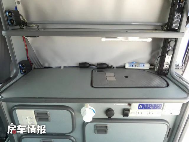 这款房车在电路上搭载了一台逆变器,提供了一块副电池,并且在车顶部还加装了太阳能电池板,水路上也具备简易的净水箱和灰水箱,所以说基本的需求还是能够解决的。