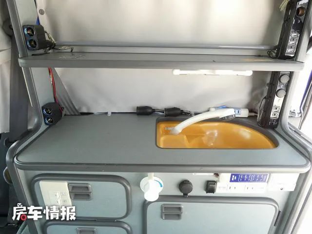 车厢尾部一侧被打造成了一个迷你的厨房操作台,台面上配备了带盖的水槽,而且水龙头是抽拉式的,平时也可以拉出车外使用。