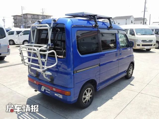全车的整体外观都喷涂了蓝色,方方正正的造型非常符合K-car的标准,车顶部还增加了行李架,尾部也配备了自行车架,看上去还有一丝丝越野的感觉。