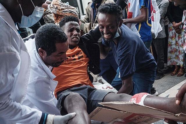 当地时间2021年6月24日,埃塞俄比亚提格雷州默克莱,伤者在医院接受治疗。附近一处集市22日遭到空袭,造成至少50人死亡,100多人受伤。人民视觉 图根据联合国公布的粮食安全阶段综合分类(IPC)数据,目前提格雷州超过500万人急需粮食援助,其中35万人面临饥荒危机。今年4月的一份报告显示,提格雷冲突已经造成170万人流离失所,超6万难民逃至邻国苏丹。报道称,由于该地区的电力、电话和互联网线路被切断,援助机构为需要食物和其他服务的人提供帮助的能力受到了限制。面对国际多次强调提格雷地区急需援助,埃塞外交部发言人迪纳·穆夫提(Dina Mufti)表示,要实现全面停火必须要通过埃塞政府和“提人阵”双方的努力,呼吁“提人阵”采取行动。穆夫提也表示,目前尚不知道救援物资将以何种方式进入该地区,以及前往该地区的航班状况如何。