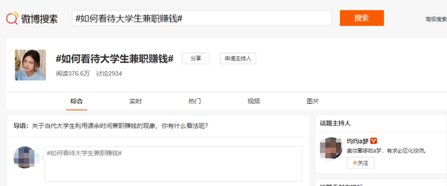 在微博上面就有一个#如何看待大学生兼职赚钱#的话题,这个话题有376万的阅读,并且引起了接近3000名网友的讨论。对于这个问题,我们采访了一个大学兼职做到月入过万的“成功人士”,希望通过真实的案例来回答。