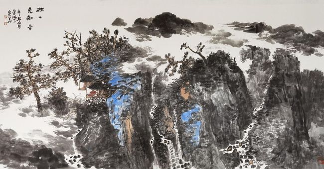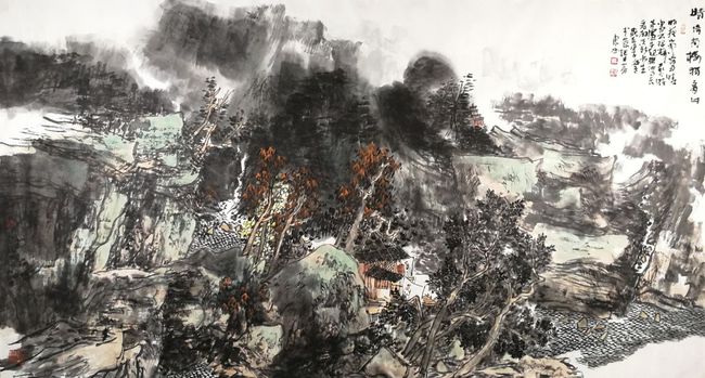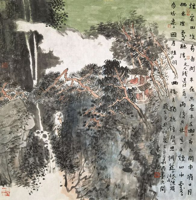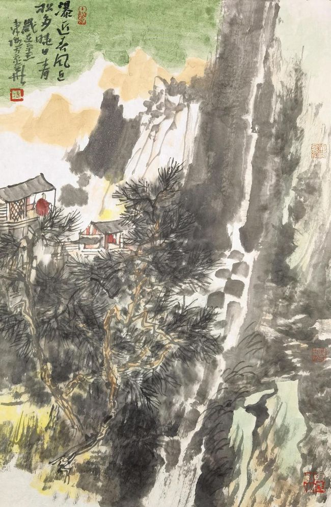 随类赋彩,在水墨里渲染青绿浅绛,这山水便是色不碍墨,墨不碍色的气韵精品!一天清淑气,万里碧榆风!无论是百尺悬瀑,还是板桥寒泉,抑或是深林杂树,危峰林立,都沉浸在毫无烟火气的清悠气韵里,引人卧游,可居之品,一目了然。站在这样的山水作品面前仰观,心为之摄,情为之牵,总有心遥目断兴难尽,何时方到三山巅的感怀!