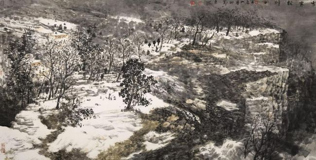 谢赫论画有六法之言,这是保持中国山水“很中国”的精要法度。张东升画山水,谨持六法,首先拥有骨法用笔的强烈意识和卓越实践!如若笔不到位,行不见力,画出来的山水难以立骨传神,多有涂抹的粗头乱服。现在看张东升先生的山水作品,落笔钧直,毫无疲糜,勾勒长线一气呵成,顿挫短线有效分明。各种皴法游刃有余,不让一根线条成为散兵游勇!不怕线条多如雨,一并组织得有秩序,不凌不乱。长短相较,前后相随,高低相倾!把中国画依线条造型的真谛表达得无以复加!得笔法之精妙,既是得画法之要义!就算是站在极为挑剔的角度,也不能在他的画里挑出一线一丝的流弊!骨法用笔,应物象形,张东升的画正是古今相续的经典,所以在他的画里,可以看到范宽山水的浩茫,也可见米家山水的苍润!