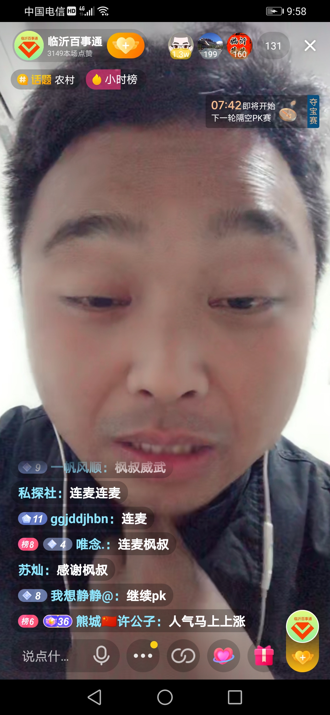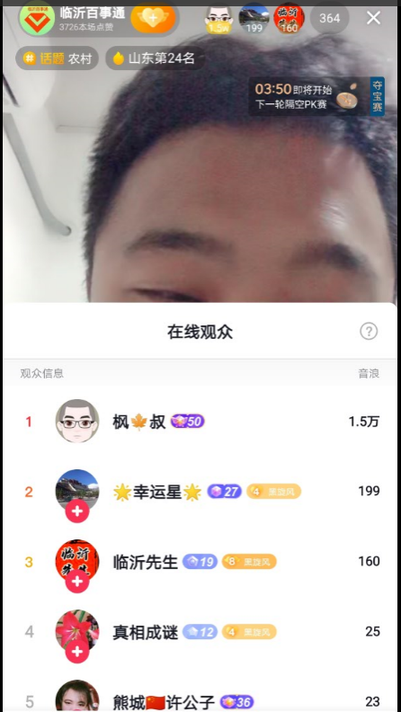 昨天下午,“临沂百世通”在地头上采访播种花生的当地村民,晚上,他在直播间里,疲惫不堪地上了一会线,这时候,神话一样的“枫叔”突然光顾了“临沂百世通”的直播间。