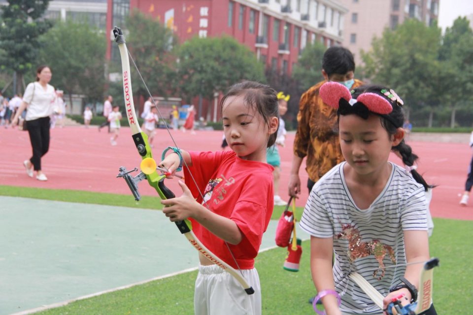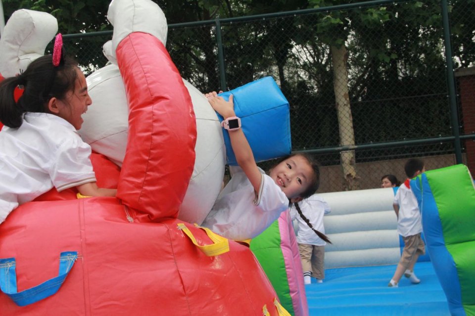 在学校操场旁还精心设置了游乐区,孩子们在充气城堡尽情嬉戏,套圈、射箭、抓娃娃等项目让孩子们玩的不亦乐乎。
