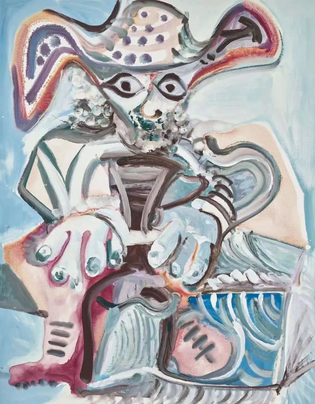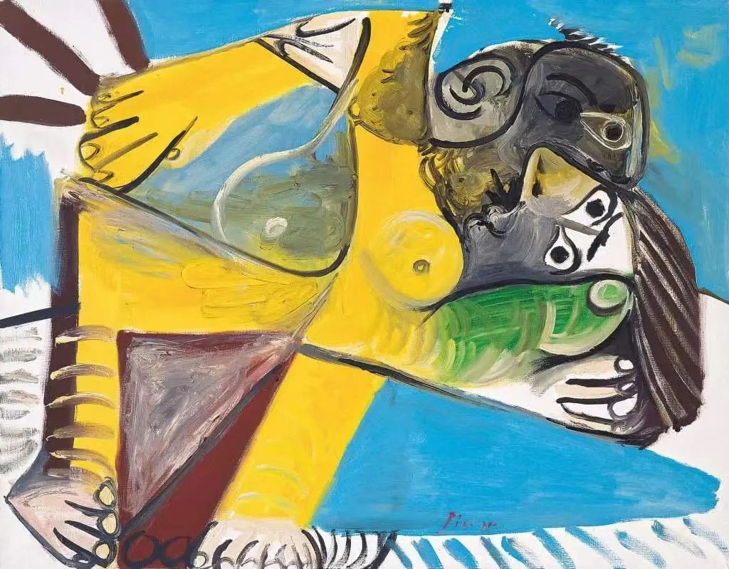 画中斜倚的裸女一头深色秀发,清冷的面庞和古希腊式的轮廓都暗示她即艺术家的妻子杰奎琳,她是毕加索晚年深爱的灵感缪斯,以其小巧玲珑又曲线丰满的姿态成为他梦幻想象的主角。尽管杰奎琳并未以传统方式为毕加索担任模特儿,但她的气息风度体现在他作品的方方面面,将艺术家的无穷想象力和丰富灵感定格在一系列雕塑、素描、版画和油画作品中。毕加索透过高度简洁而又过目难忘的线条描绘人物躯体,以缩略的方式几笔即勾勒出主角形体,仅用少许元素便创造出总体印象。