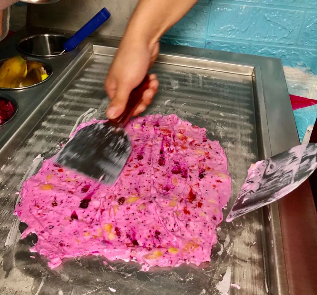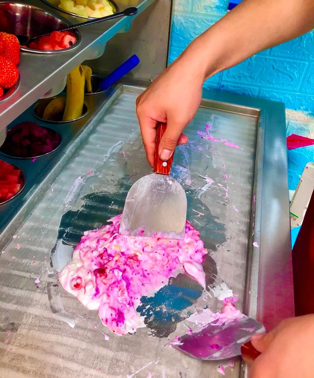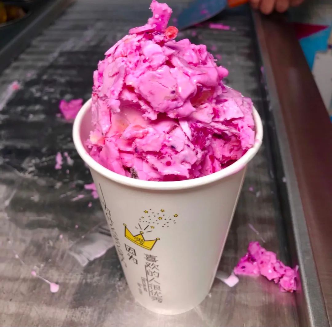 你别说,这炒酸奶真和别人家不一样,吃起来一点都不是冰碴那种,软绵绵的,真像吃水果捞一样,和水果捞一个味。爱吃水果捞的一定要来吃。