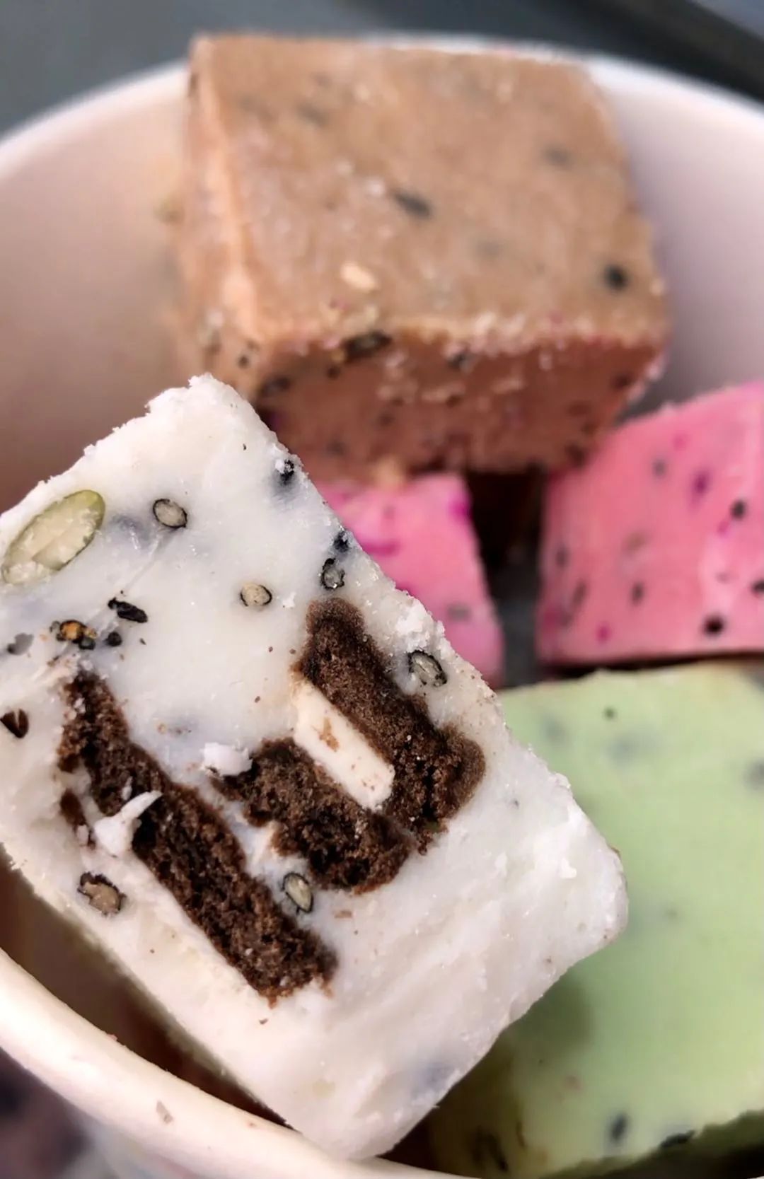 他家这个厚切酸奶就是有很多种口味,里面有巴旦木,核桃仁,黑芝麻什么的。