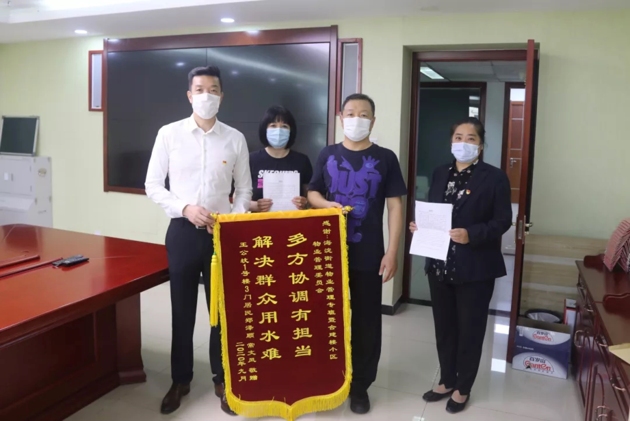 事发后,合建楼社区居民给海淀街道物管专班和社区物管会送来锦旗和感谢信,感谢街道、物管会以老旧小区改造为契机推动多方协调,解决困扰部分居民“用水难”等问题。