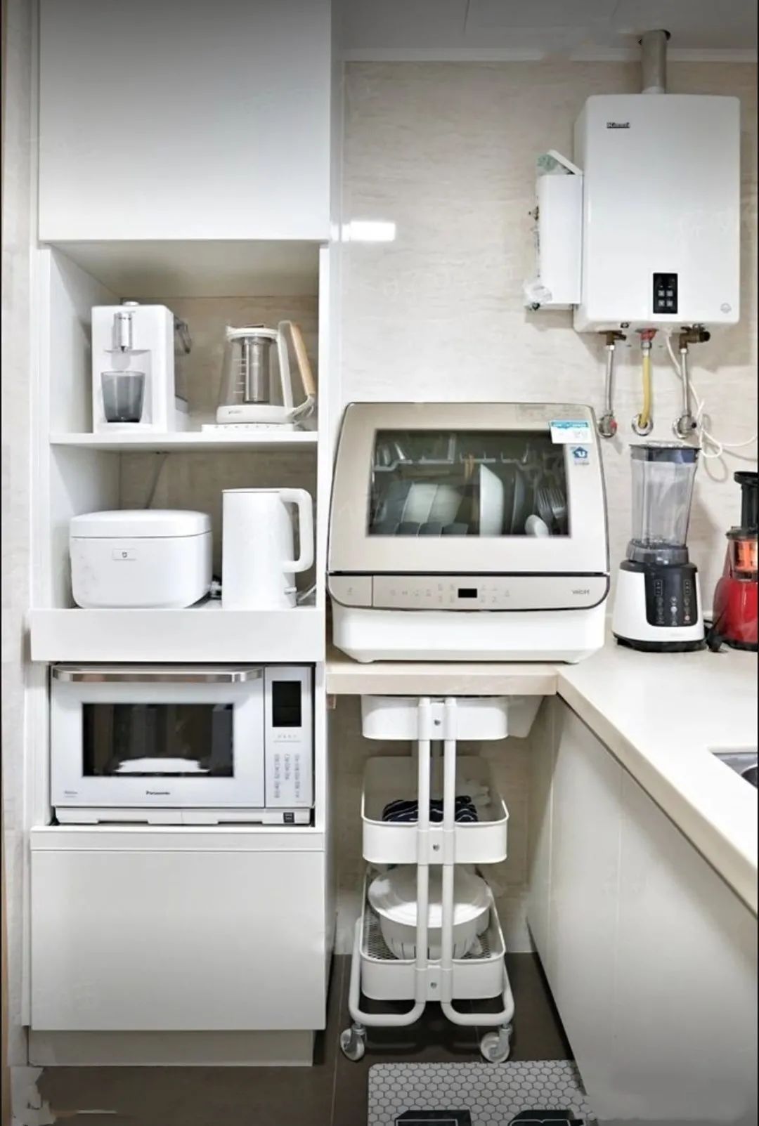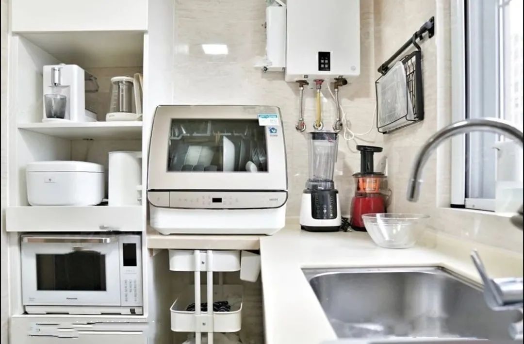 进门的位置除了打台面以外,还设计了一个电视收纳柜,这个收纳柜可以说是我家最主要的一个收纳主力军了!各种小电器都塞在里面,节省了好多空间,设计师直接在柜子里留出插座,实用的时候也不用拿来拿去的!非常方便!台面底部还做了一个无柜门空间,可以将转角的区域利用上,外侧用活动的小推车收纳。非常方便!洗碗机选择台式的,两个人的碗碟足够用了。