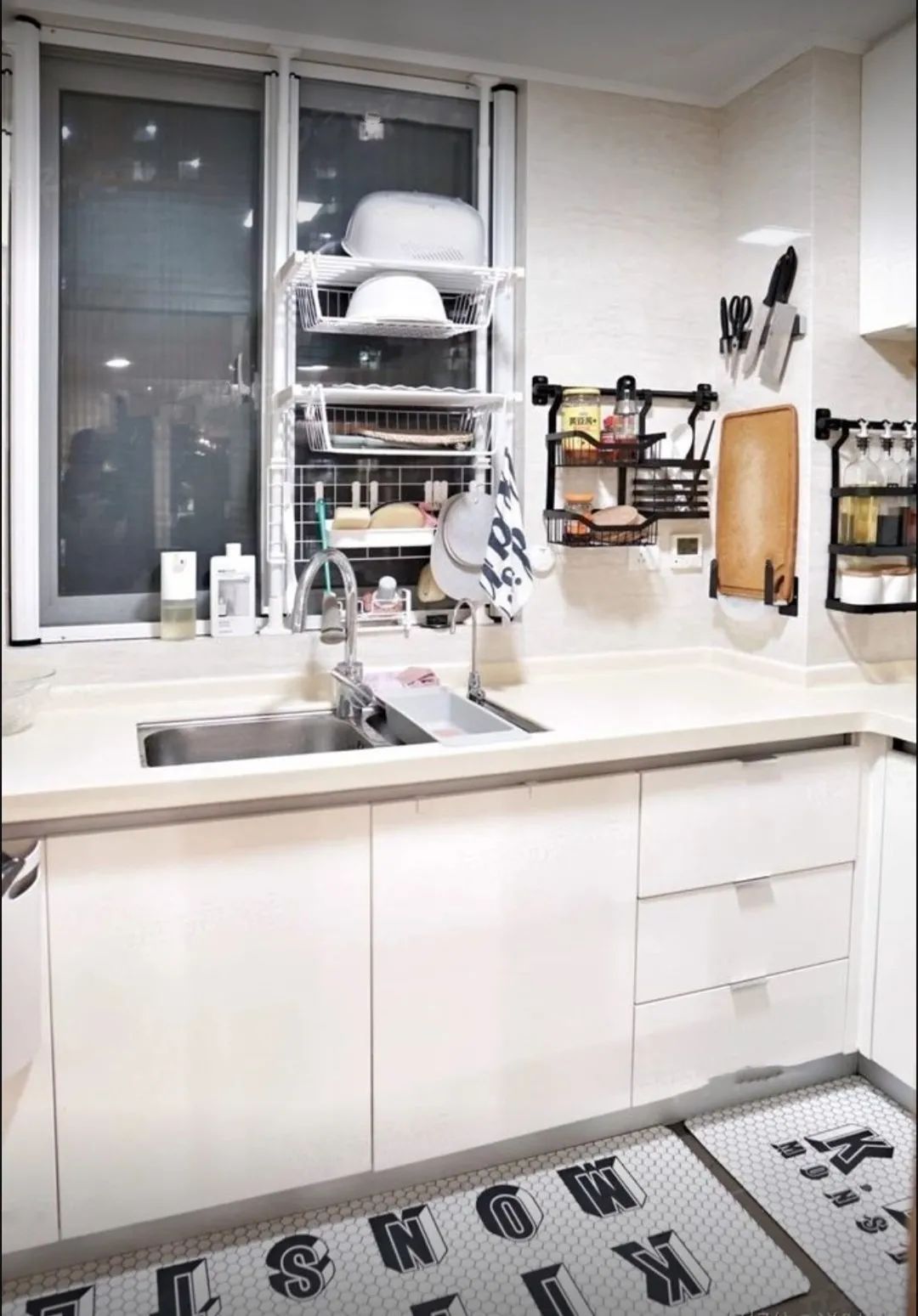 厨房内部是一个小U型的橱柜设计,两侧空间增加了台面和储物的需求!水池在窗户下面,很多业主家的水池都会对着窗户,我觉得这个位置比较通透,采光也好,刷碗的时候能看的更清楚一些,而且做家务的时候,抬头看看窗外的景色,还能放松一下!