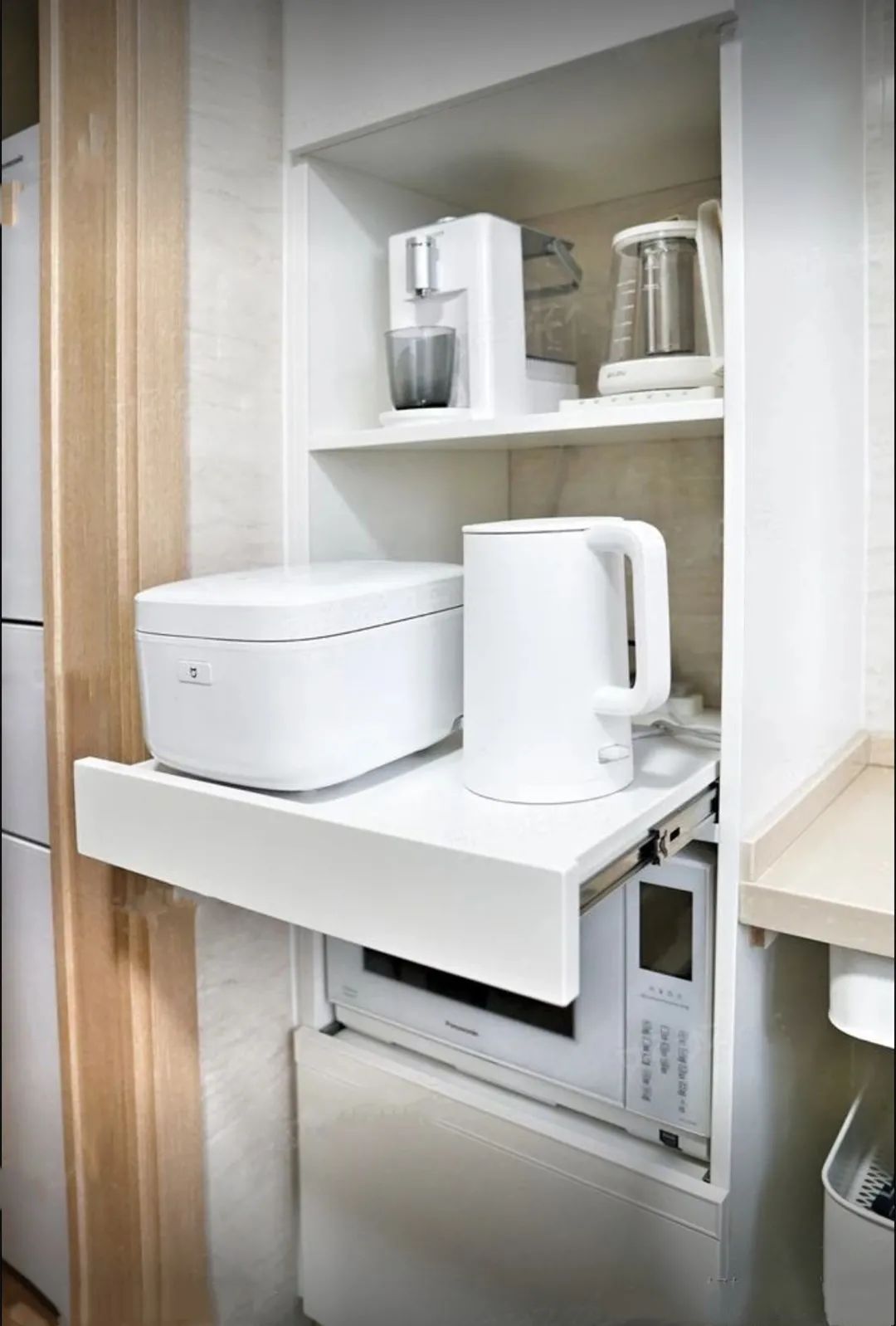 这里也是小编最喜欢的地方,可以将各种不规则厨房电器统一收纳起来!
