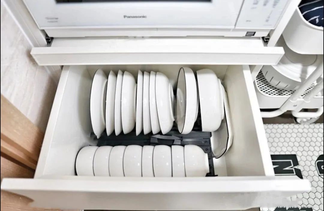 电器柜下面的抽屉用来收纳碗碟。