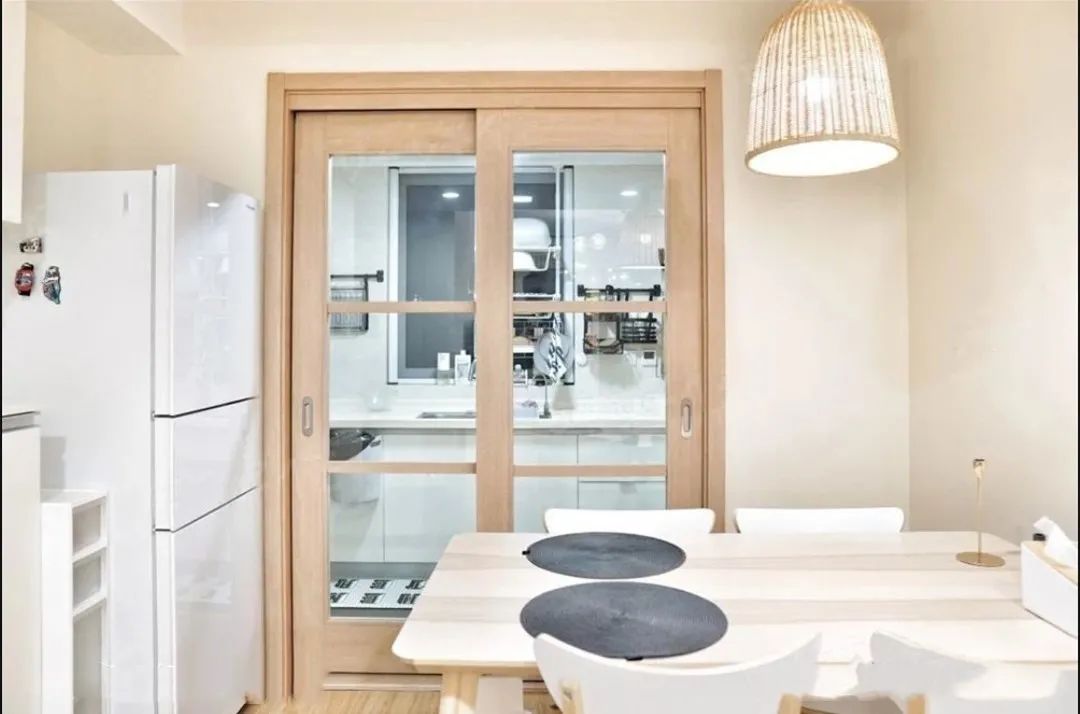 为了增加空间的通透性,厨房和餐厅之间的隔断门,采用了原木框加玻璃的设计。原木颜色温和大方,玻璃通透明亮,整体感觉很舒适,并且大面积的推拉门,还能将厨房的自然光引进到餐厅。