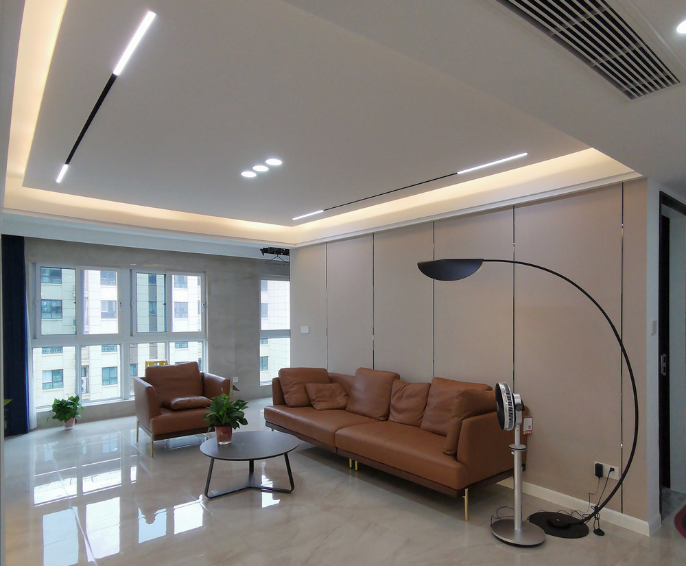 如果有吊顶,暗装射灯+灯带也是设计师最喜欢的组合之一,另外还有,磁吸线性灯,横着装吊顶里,或者竖着嵌入墙体,照亮家里的暗角,都让人有惊艳感。暗装射灯最好选择深防炫的,藏在吊顶里,调整好光束角后,不但光线均匀不刺眼,还能营造出见光不见灯的效果。