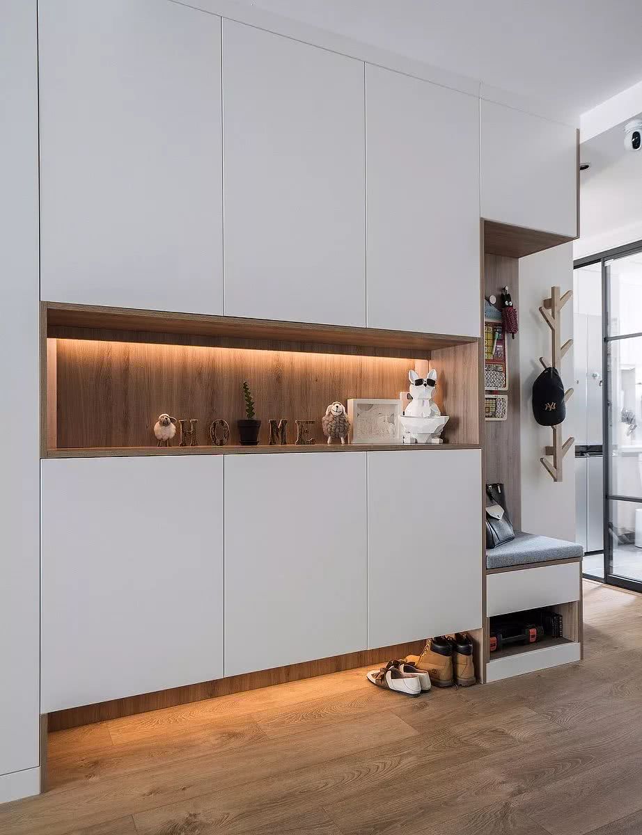 2,在鞋柜的上方和下方,分别装两条灯带,不但方便放钥匙换鞋,还能有效地烘托氛围。