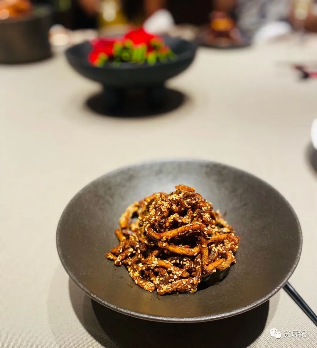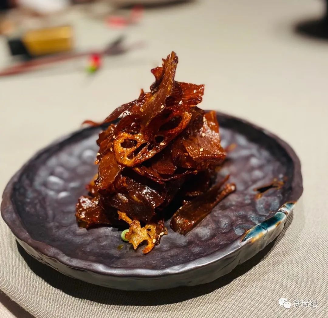 芝麻鳝丝太适合下酒了,炸得刚刚好,整个味道也是恰如其分地闪现着,脆脆的,令人心生爱意的那种。陈皮灯影黄牛肉同样是一道教科书式的下酒菜,陈皮为四川凉菜经典味道,将牛肉与陈皮慢煨交融,最后添加一抹淡雅的椒麻味,牛肉薄可透光,优秀的。蜀锦古法水煮肉片,如果没有人拦着的话,我可以下两碗米饭的那种。