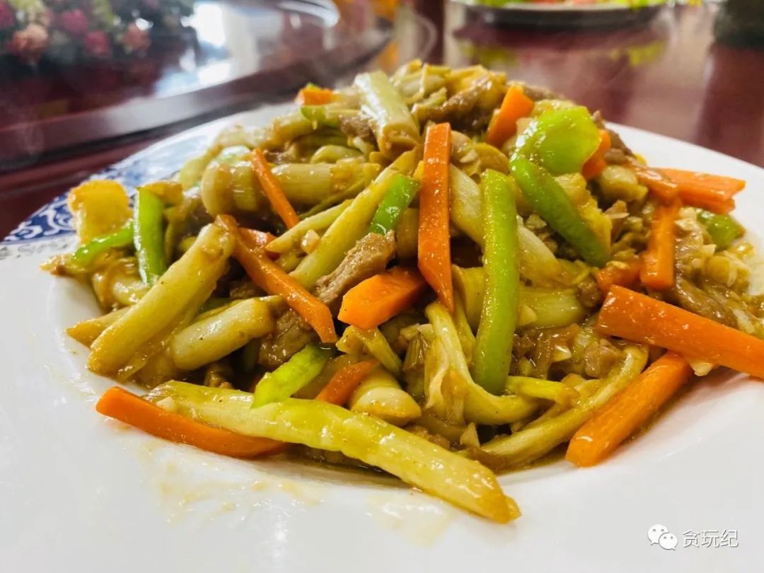 扣肉榛蘑同样是一道教科书式的扣肉样本,虎皮完美,酱香颜色刚刚好,搭配牡丹江的大米饭,很想再来一块(我的胃已经不允许我这么做了);那年秋天的茄子感觉又是一道与锅包肉殊途同归的菜,却是很温柔的把你击中的那种;甚至连豌豆尖都是坐飞机来的,清爽无二的那种小菜。