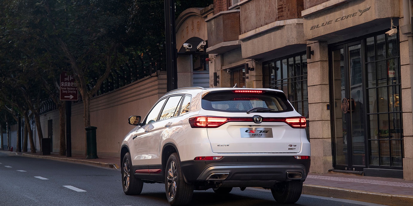 长安CS75的尾部采用了当下流行的贯穿式尾灯的设计风格配合下部双排气,使得整个车身较为整齐统一。