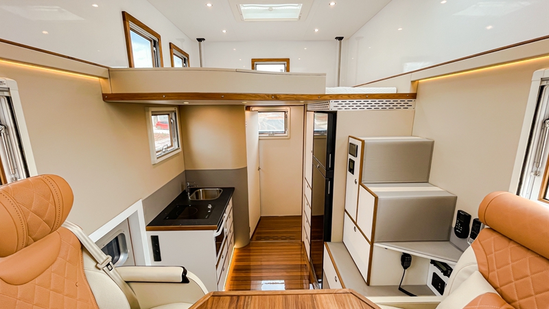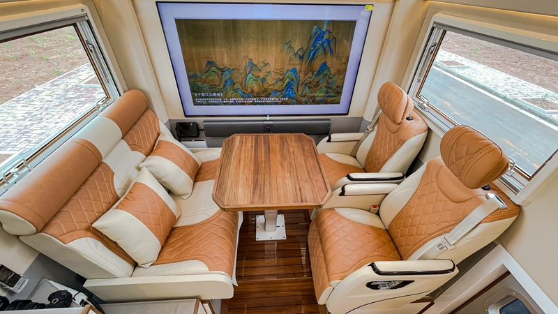 房车部分,整车游艇级柚木实木地板奢华大气,房车专用定制电动升降双人床、房车二层顶部双人豪华大床、四人对坐沙发变化的双人床等三张大床,满足5人宽松睡眠需求。厨房区域内外双厨房,内部一体式多功能厨具组合操作台,可快速制作简餐,外部房车定制户外移动厨房煎炒烹炸完全可行。还有独立的淋浴间和衣帽间,以及智能的空调通风系统,确保房车空间环境更洁净。房车后方有重力背负系统,可携带哈雷摩托车等小型交通工具,将房车越野生活品质再升级!