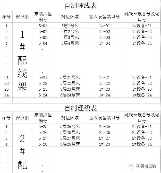 综合布线系统,在我们开始布线之前,需要在图纸上对每个点位进行编号,这样我们才知道,每条对用哪个位置。在网线接入配线架的时候,我们需要根据各个点位的功能及区域分别接入不同的配线架。开始理线之前我们则需要先理清楚哪些点位接入哪个配线架,这样才能更快捷、更好的整理出每一组线,那么就需要自制一份理线表,理线表需要清晰的写清楚各个编号的线缆对应的区域及接入设备的位置,如下图:以医院住院病房举例