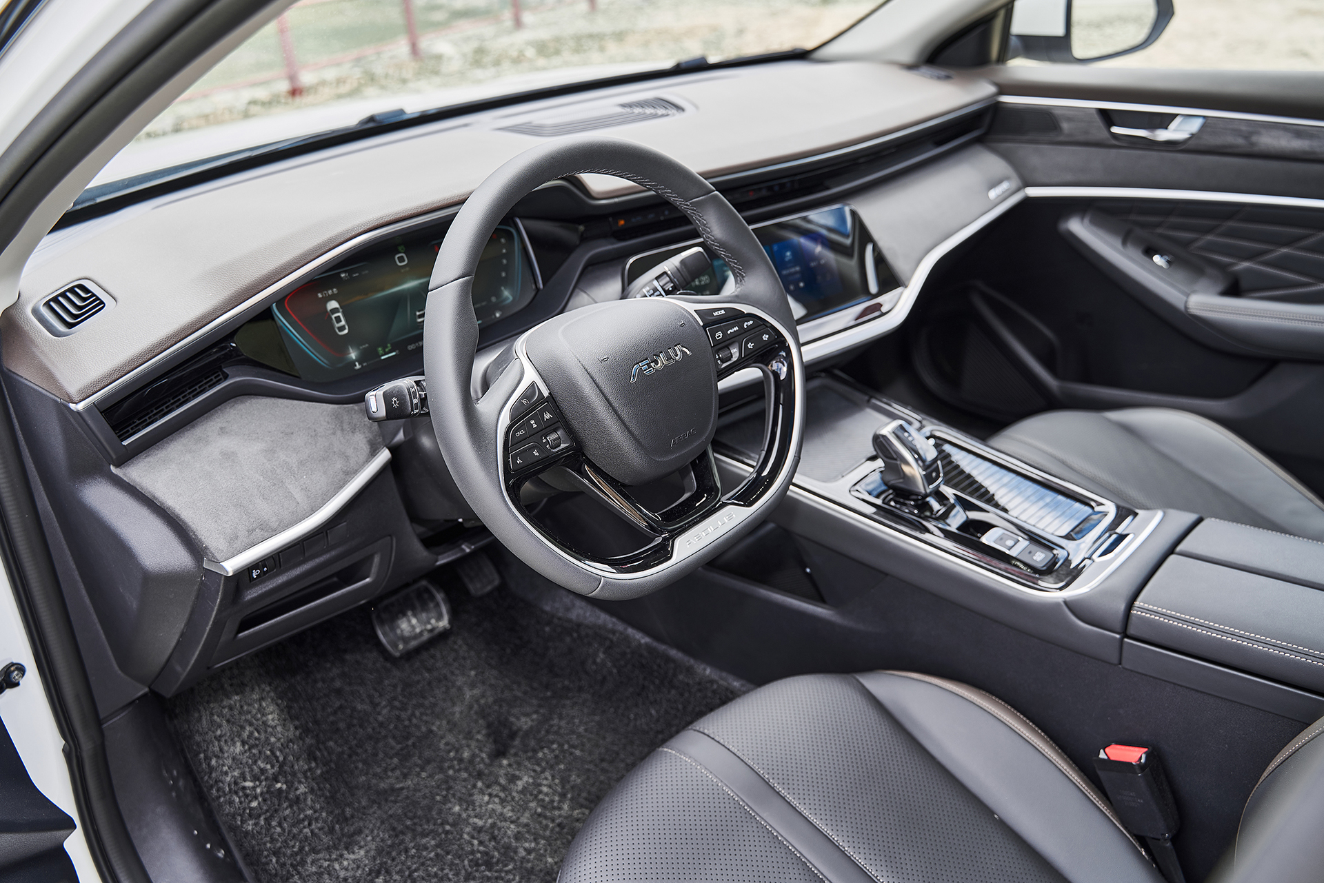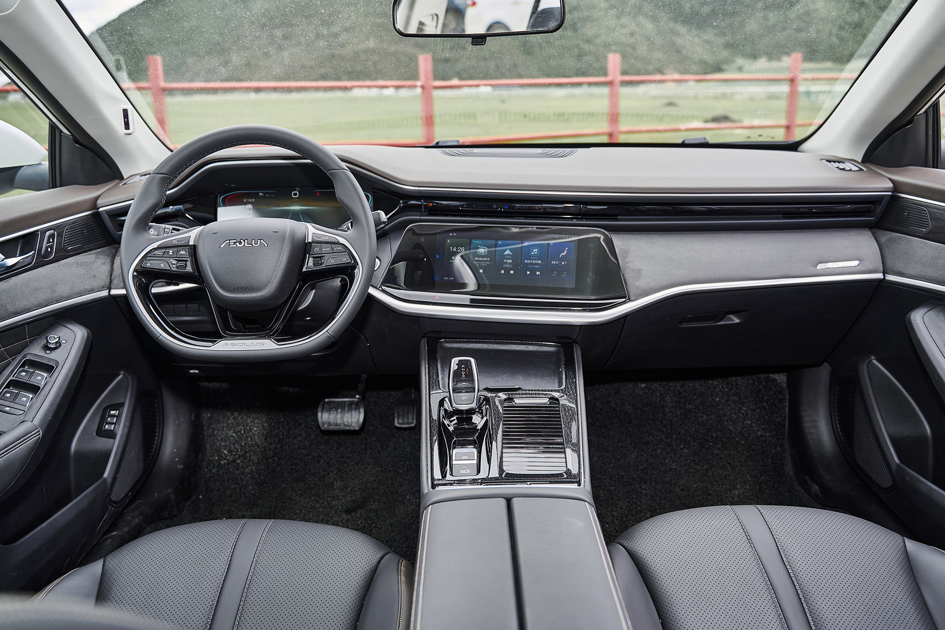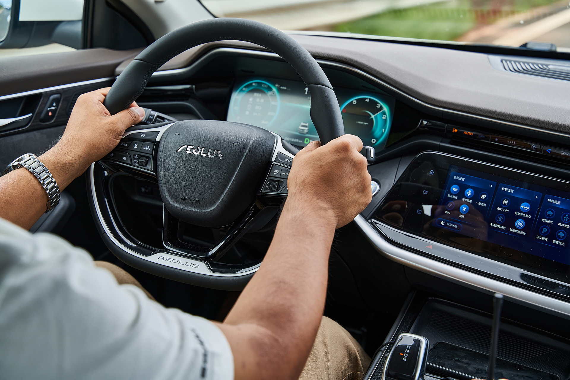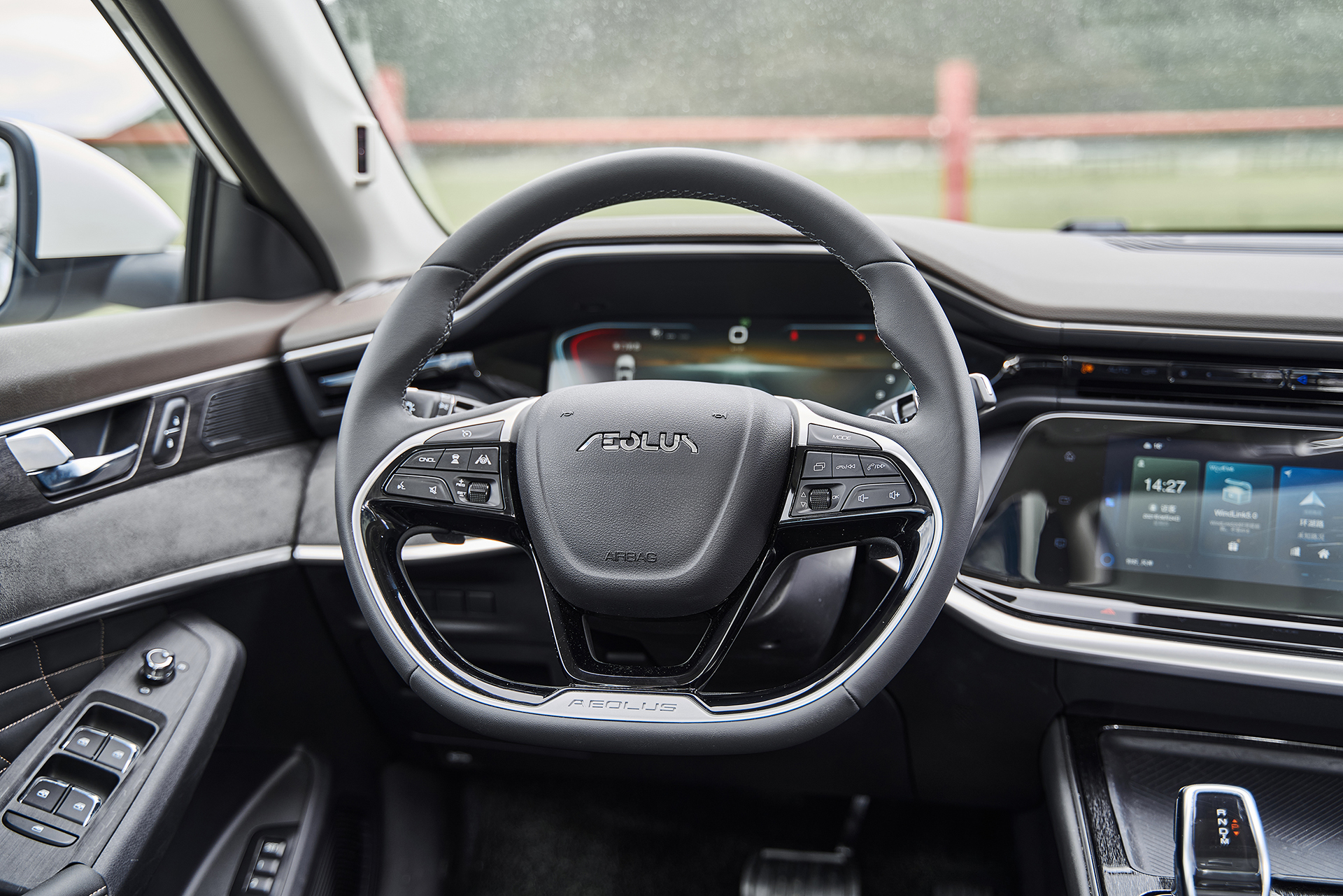 平底方向盘,通过亚银镀铬、亮黑塑料和深灰皮革结合缝线装饰,造型时尚精致,只是感觉下方的AEOLUS英文标识和方向盘中间的标识有些重复,下面改成MAX字样会更好。