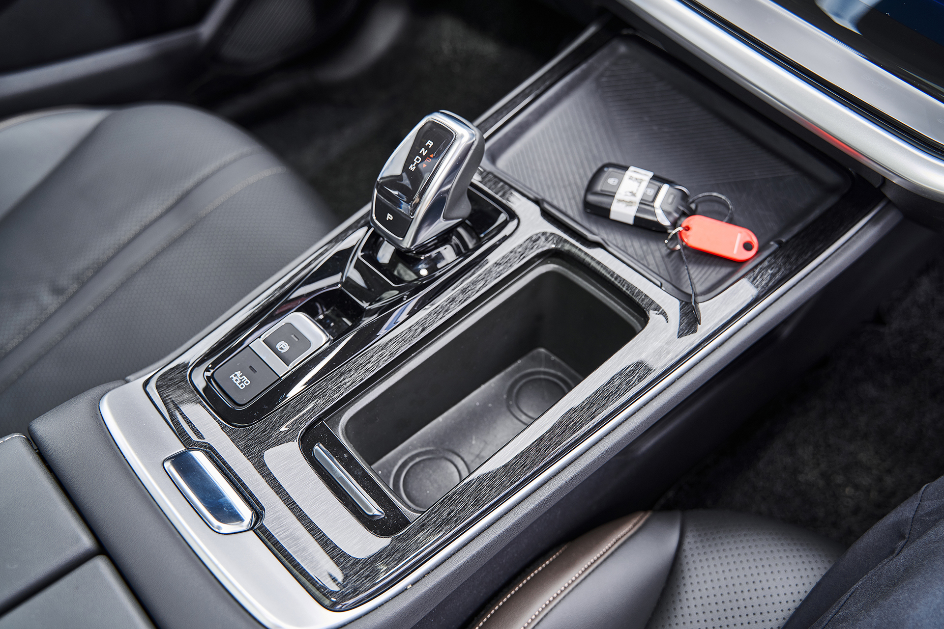 中央控制区域看起来非常简洁,七速双离合的电子档把精致小巧,下面两个按钮分别是电子驻车和AUTO HOLD的功能。打开盖板则是有一个可折叠的限位装置的杯架。