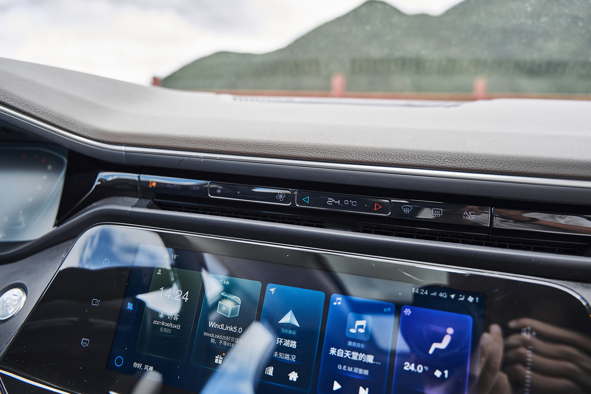 在中控屏的上方,特意设置了控制智能空调的面板,可以通过单点触控和滑动触控的方式调节,有凹槽的造型设计,在盲操作时更精准和安全的调节空调。