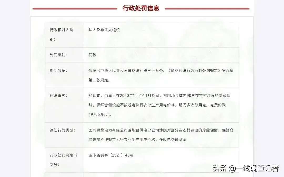 【国网冀北电力公司围场分公司因违规收费被罚】据“信用中国”公开信息显示,经调查,当事人在2020年1月至11月期间,对围场icon县域内90户在农村建设的冷藏保鲜,保鲜仓储设施不按规定执行农业生产用电价格,期间多收取用电户电费价款19705.96元。对此,围场满族蒙古族自治县市场监督管理局对该公司作出罚款人民币19705.96元的处罚决定。另据该企业官网显示,国网冀北电力有限公司隶属国家电网有限公司,于2012年2月9日正式独立运作。
