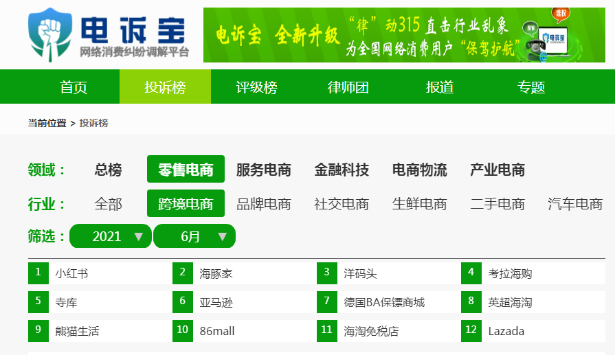 据国内知名网络消费纠纷调解平台“电诉宝”(315.100EC.CN)显示,6月跨境电商领域的投诉事件涉及小红书、海豚家、洋码头、考拉海购、寺库、亚马逊、德国BA保镖商城、英超海淘、熊猫生活、86mall、海淘免税店、Lazada等。