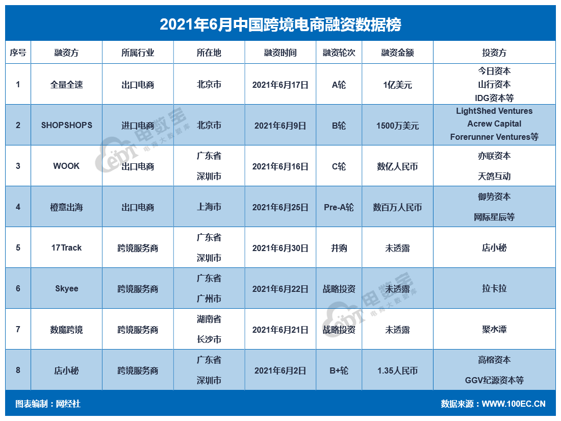 据网经社“电数宝”(DATA.100EC.CN)电商大数据库显示,2021年6月跨境电商领域共有8家平台及服务商获得融资,分别是全量全速、SHOPSHOPS、WOOK、橙意出海、17Track、Skyee、数魔跨境、店小秘,融资总额超8.8亿人民币。