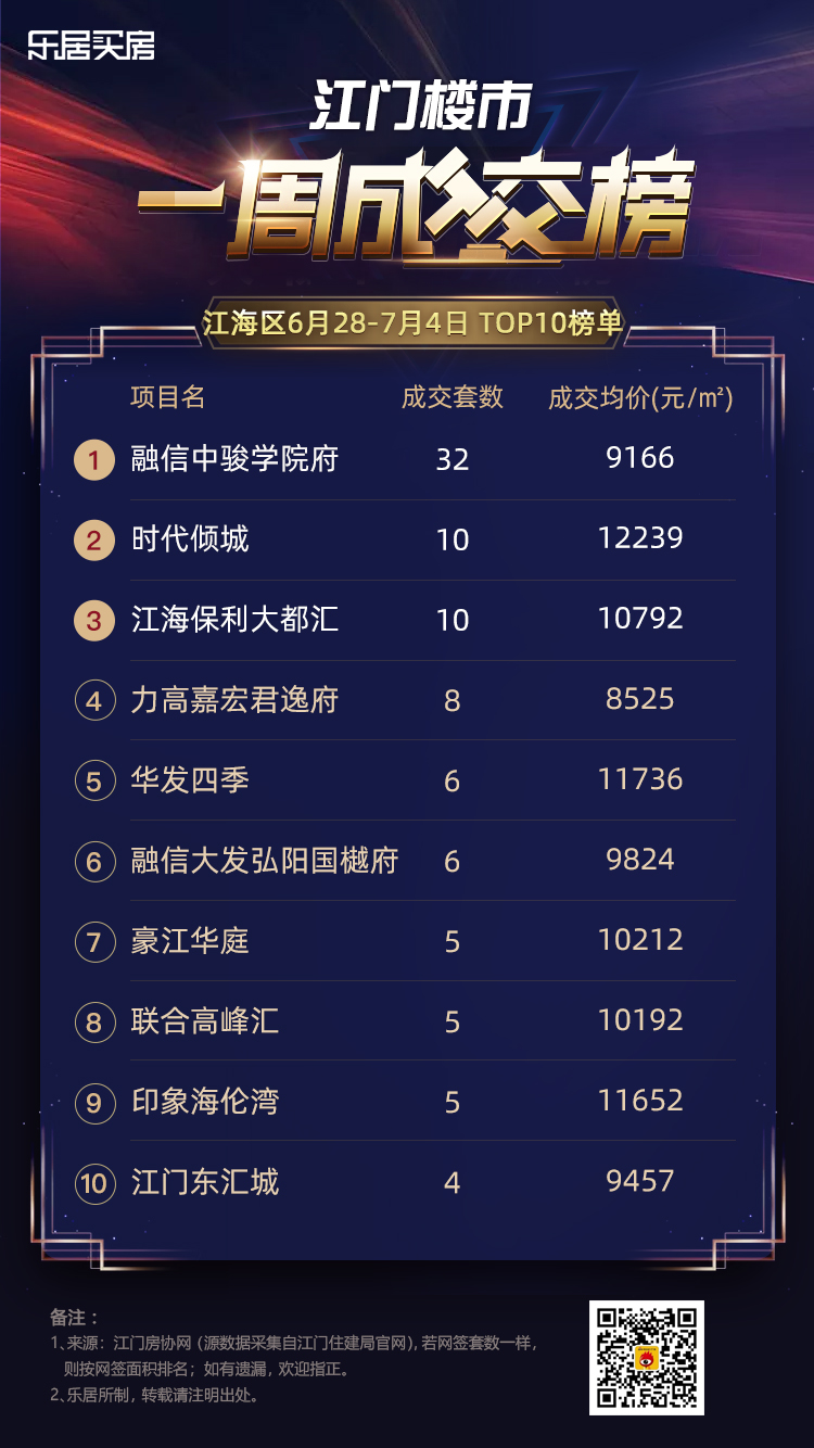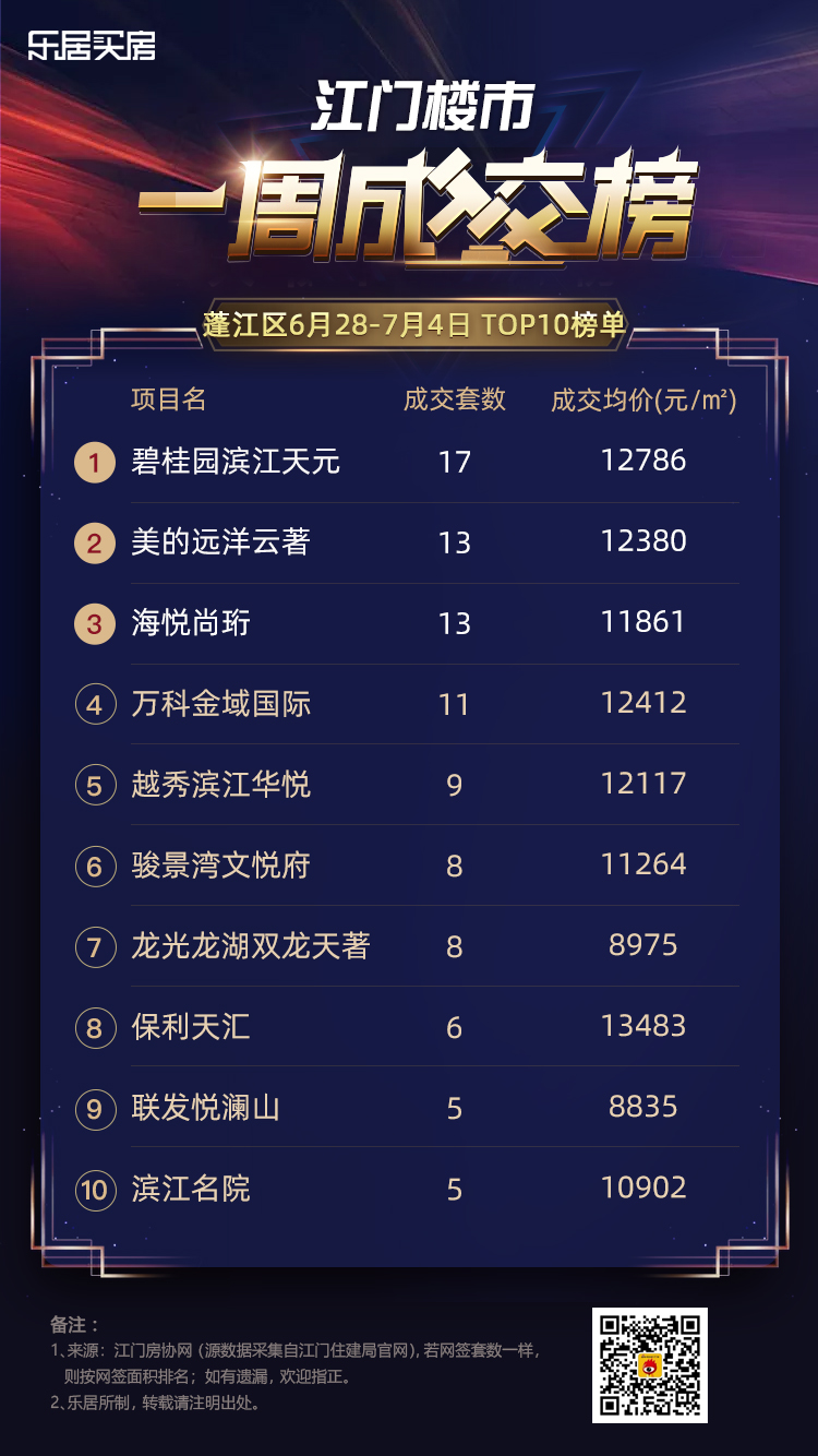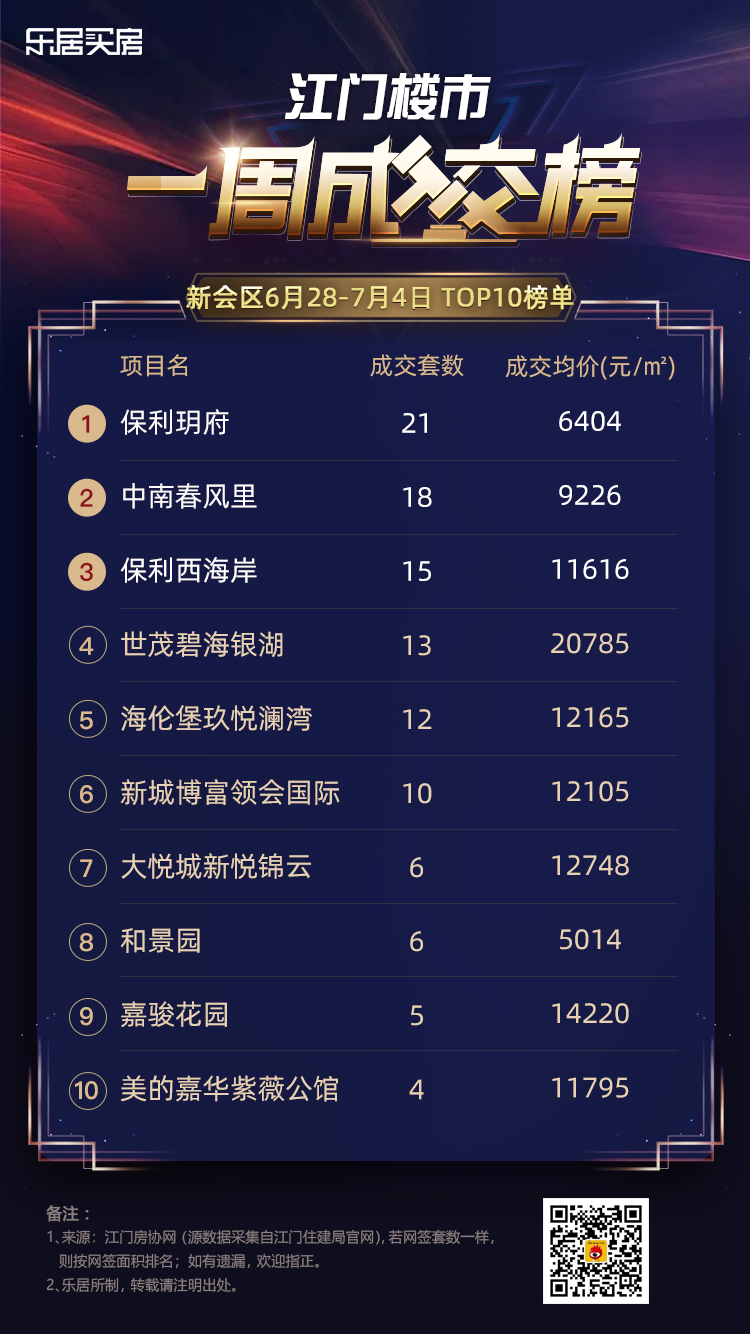 乐居买房讯 上周(6月28日-7月4日)江门三区个盘具体网签数据出炉!