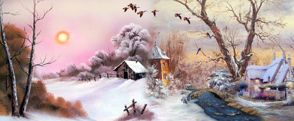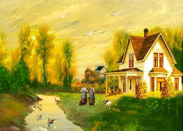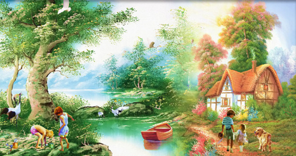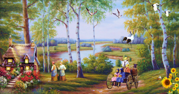 众所周知,风景名画往往是真山真水的写生,不少市民看不出这种名画有什么好,不就是我们经常见过的实景吗?所以商家按市民喜好“创作”出市民心中最理想的“梦中家园”,比如这边在最恰当的地方“建”一座别墅,旁边来条小河,河上必得排列着整齐的鸭子,路边开着鲜红的花儿,旁边栽着似乎喷过绿水的树,天空永远鲜蓝,飘着不多不少恰到好处的几朵白云,白得耀眼,而且必飞着整齐的小鸟。画中往往还出现一两对情侣,或轻轻划着小船,或徜徉在林荫小道。