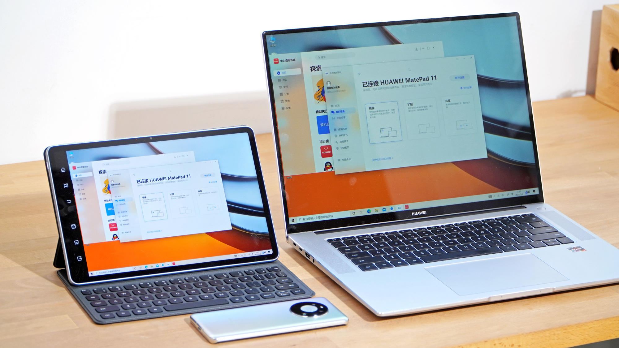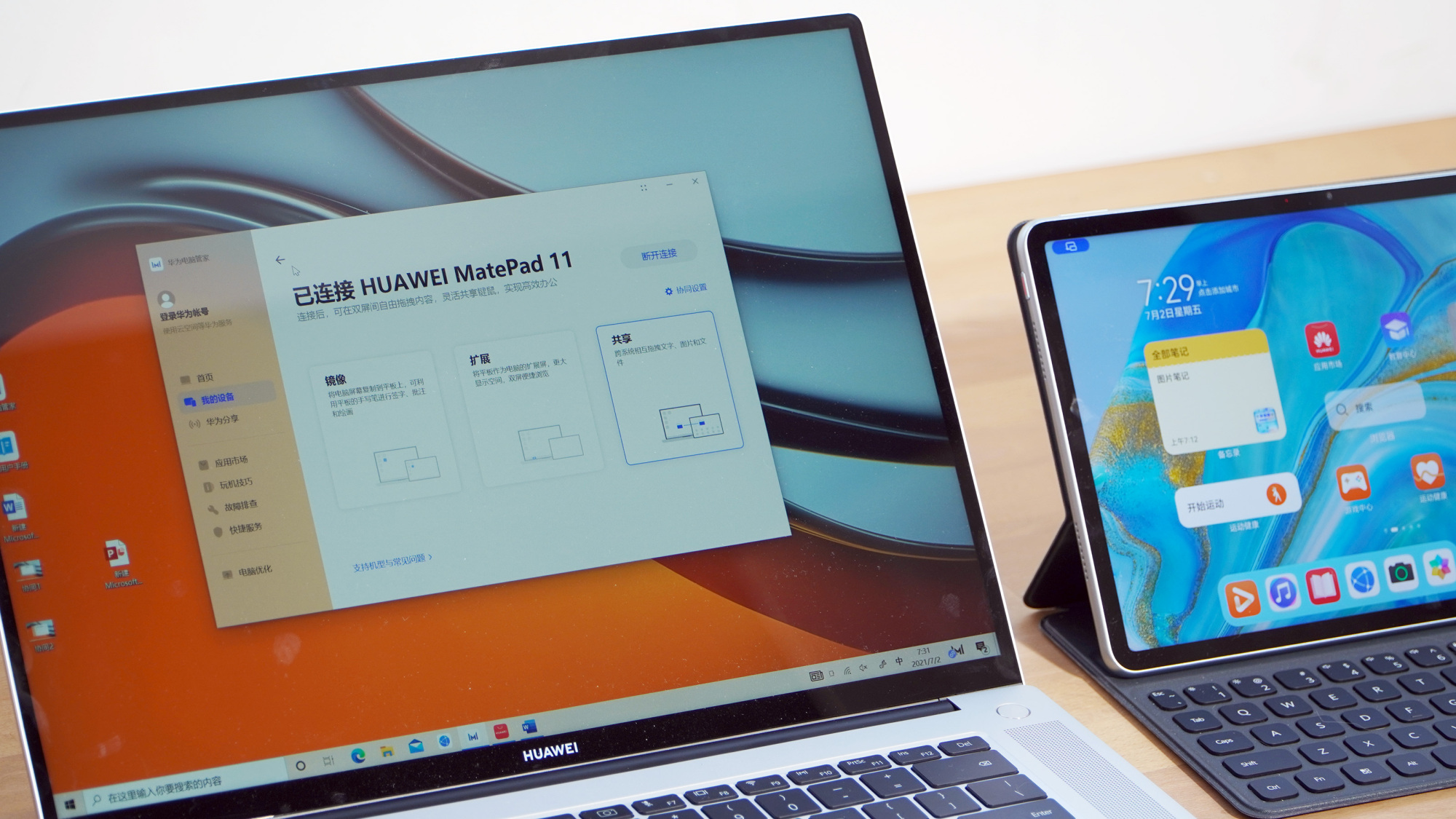 除了手机与平板协同外,手边的PC也能和平板进行连接。比如:我手中这台华为Matebook 16和华为MatePad 11,打开PC中华为电脑管家应用,搜索选择华为MatePad 11,连接后有三种模式可选:镜像、扩展、共享。