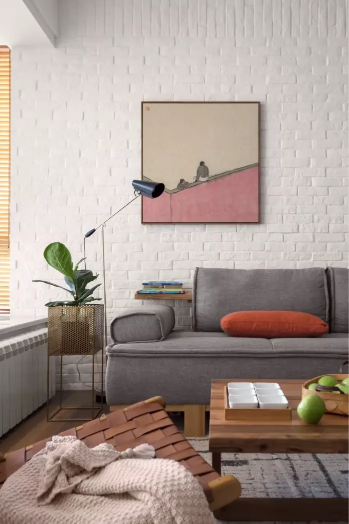 直接在满墙的文化砖上加上挂画也是不错的选择,文化砖上也是可以额外钉上隐形钉的,挂画的选择就很有很多种了。