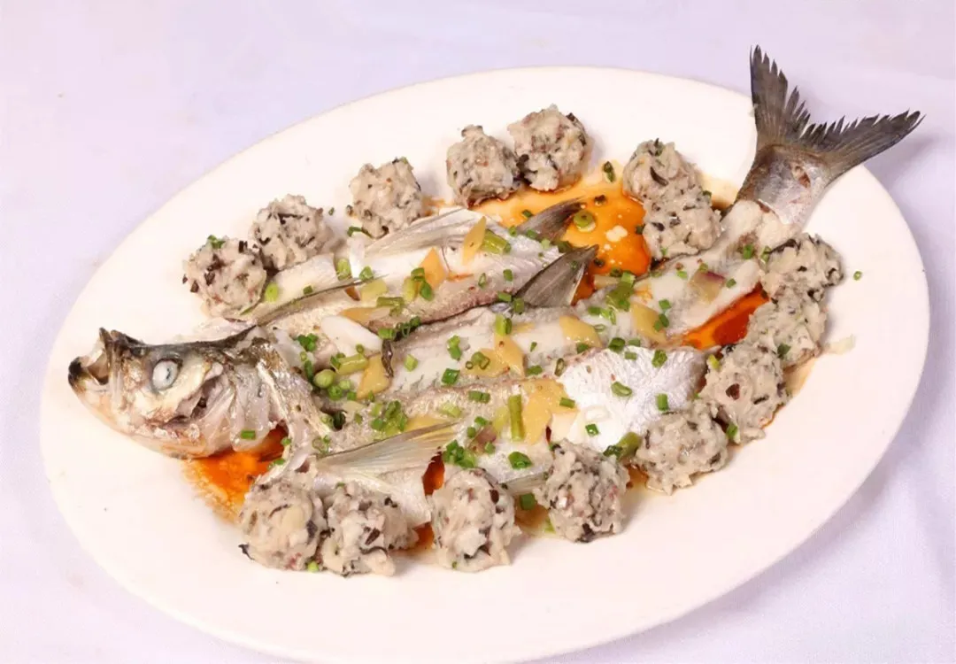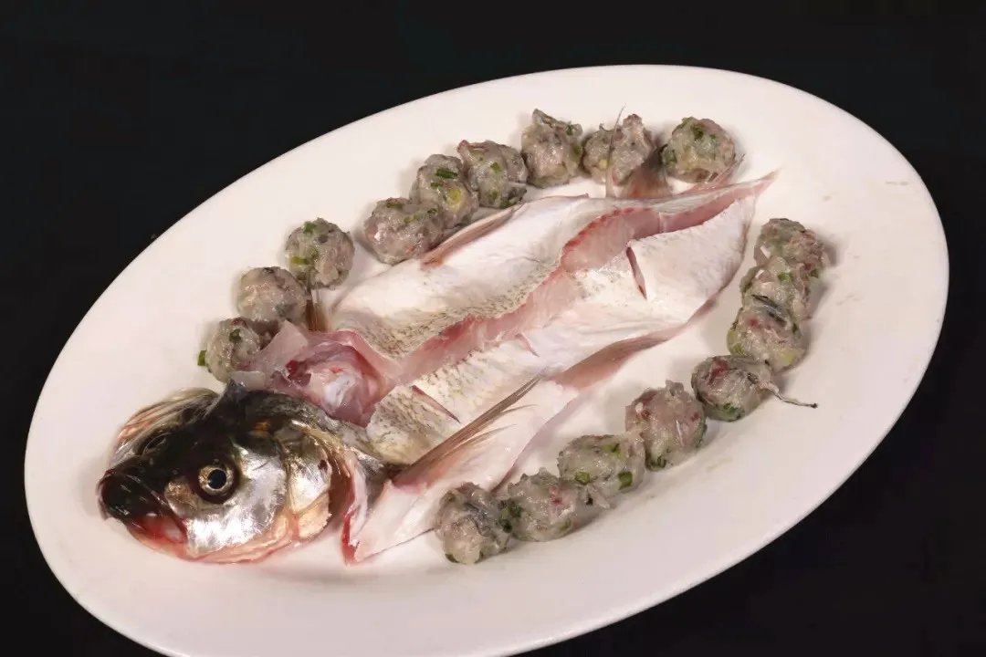 而脂肪含量稍大、质地鲜嫩的鱼腩则仍与大骨和头尾相连,放入盘中摆回原形,再在两侧排列打好的鱼丸,一同上笼蒸8分钟,取出后淋入豉油汁,激热油上桌。将一条鱼根据肉质特点分成两部分,分别加工成两种菜式并将它们融合于一盘,从这个细节,便能看得出顺德师傅对食材特性的透彻认识。