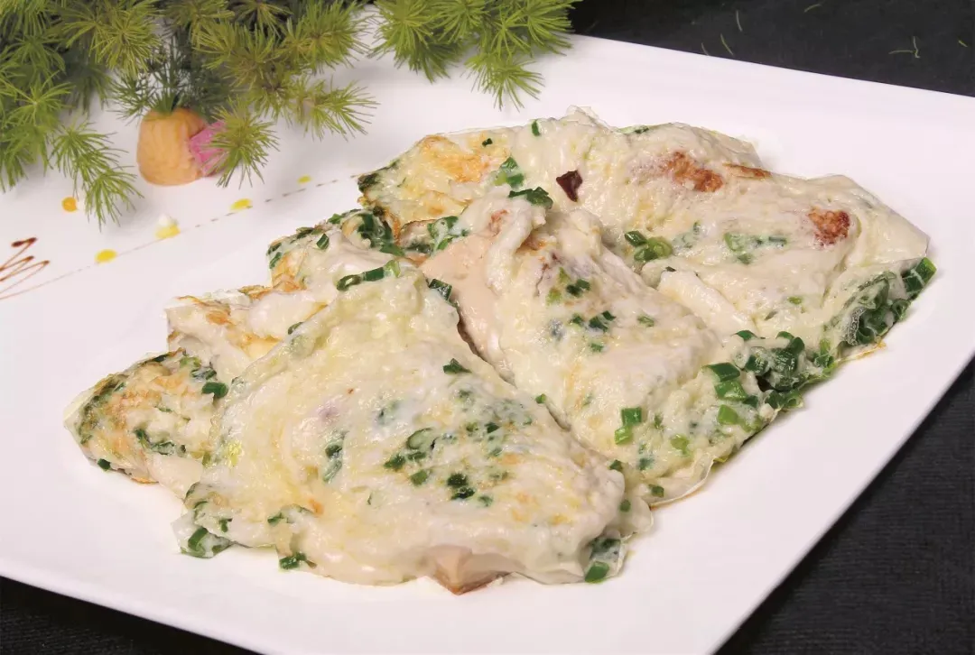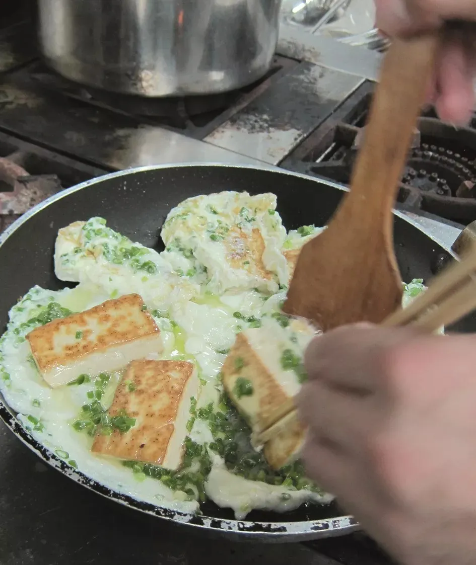 煎定型的豆腐盒加蛋清、葱花二次煎制,成菜雪白嫩滑,集蛋香、豆香、葱香于一身,是金大陆酒楼的一道招牌菜。