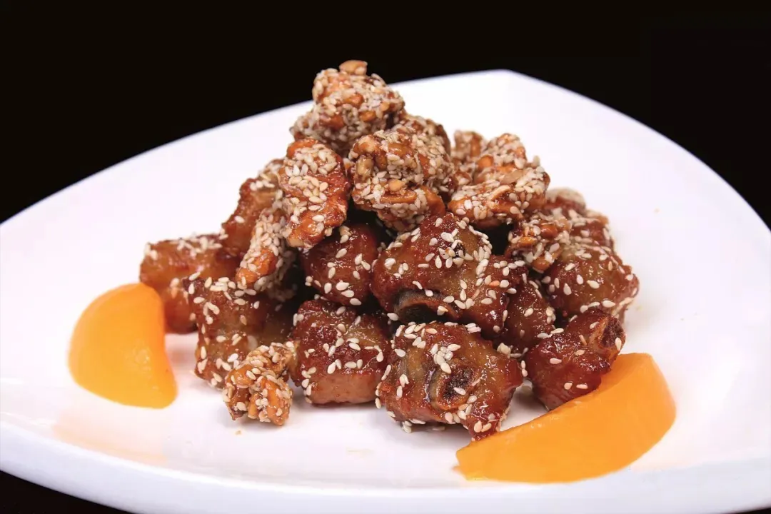 3.净锅烧热离火,下入蜂蜜15克,倒入炸好的排骨,快速翻炒至均匀沾上蜂蜜,盛入码斗,撒匀芝麻后装盘,用罐头黄桃围边,撒琥珀桃仁即成。