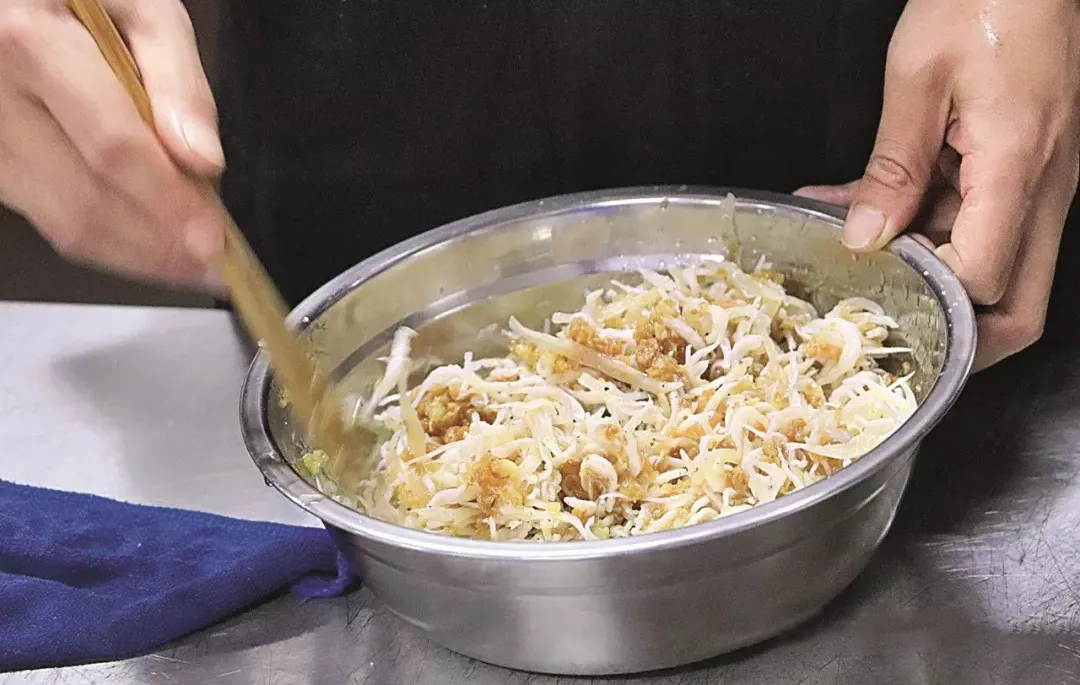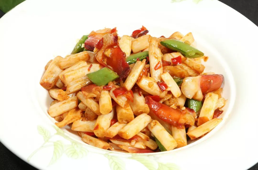 这道菜便将泡椒同红蚌、藕苗搭配,成菜口感丰富,咸鲜微辣;快出锅时淋入辣椒油,将原料染上一层淡淡的红色,卖相十分诱人。