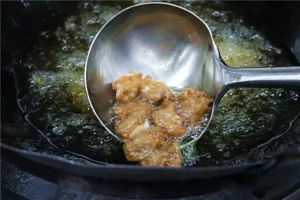 2.锅入宽油烧至六成热,下入浆好的排骨小火浸炸至定型、色泽金黄时捞出控油。然后升高油温至七成热,下入排骨复炸30秒,捞起沥油备用。