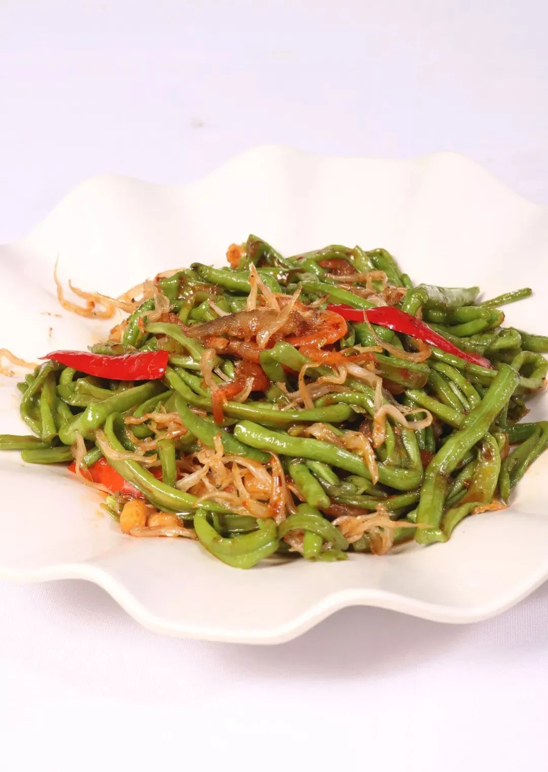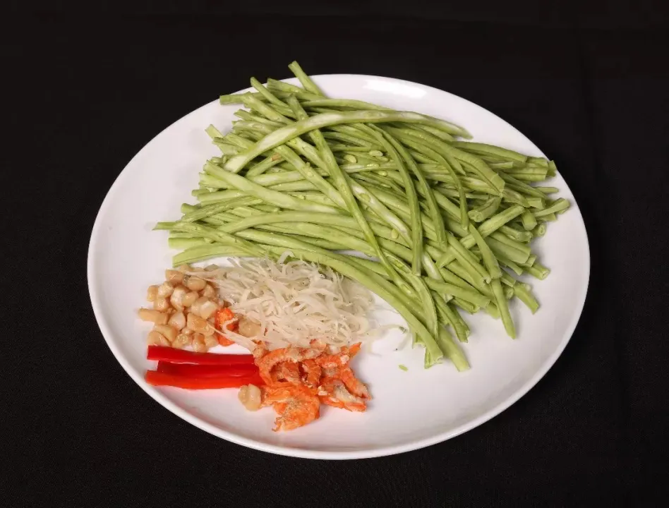 豆角从中间剖开,既便于入味又能加速成熟,避免过度加热导致软粑,搭配上鲜味十足的瑶柱、虾干和银鱼三样海货,显著提升了成菜的香气,又不掩盖豆角本身的清新,经由顺德大厨的急火快炒,锅气十足。