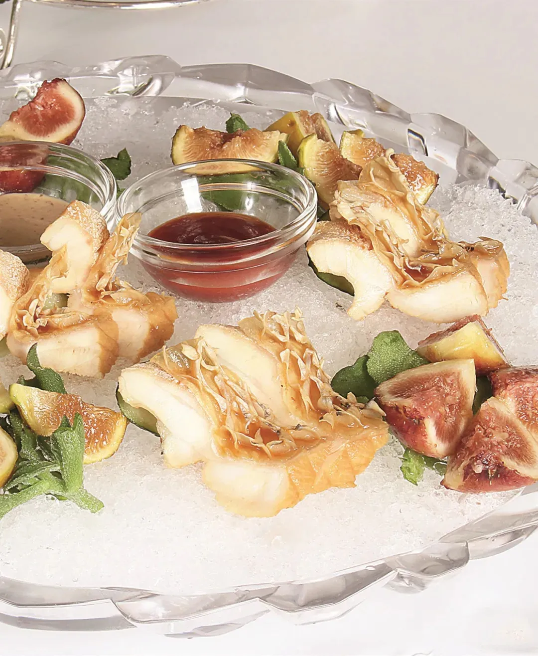 此菜做法类似江南地区的“熟醉”,将脆鲩鱼肉入葱姜水小火烫熟,再下冷卤中浸泡入味,如此处理的鱼肉紧实、有嚼劲,与鲜无花果搭配制成凉菜拼盘,清鲜爽口。