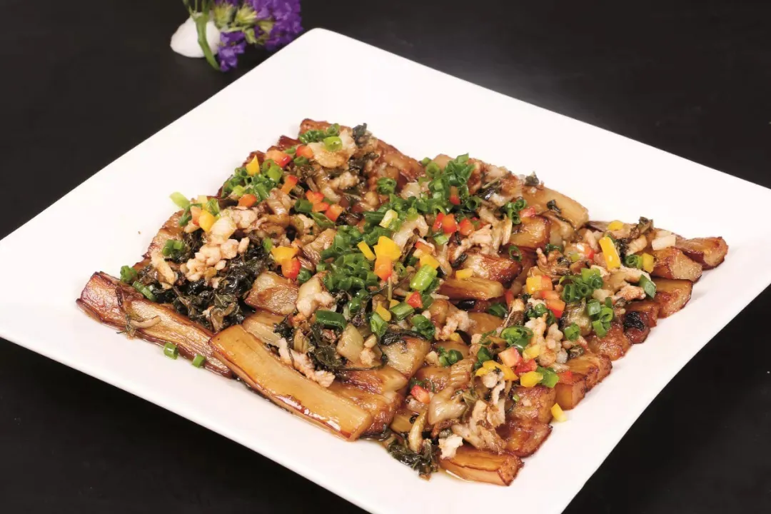 精选惠州矮坡镇的甜梅菜,炒干水分搭配肉粒,撒到茄子上同蒸,梅菜香气扑鼻,茄子软嫩入味,点击率很高。