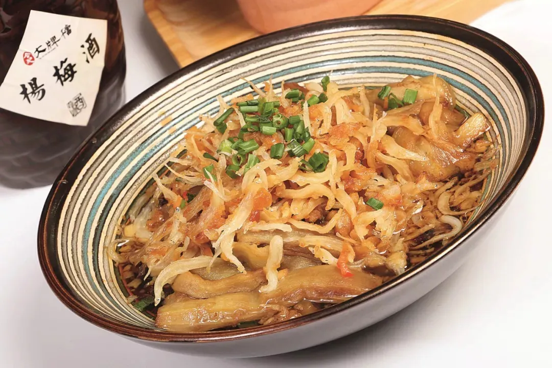 2.长茄子去皮切条、拉油,取400克摆入大碗中;蒸好的银鱼干20克带原汁铺在茄条上,再次蒸制5分钟后即可走菜。