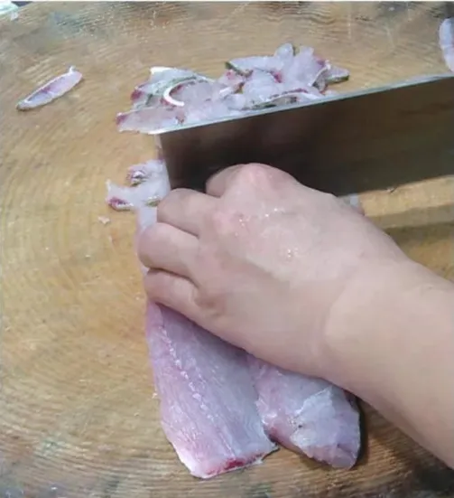 3.片下的脊背肉清洗后用净布吸干水分,顶刀切成小片,然后再将鱼片粗剁几下,待其呈黄豆粒大小,即可调入少许盐、糖、味精、胡椒粉,摔打至起胶。