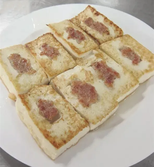 1.将豆腐改刀成大小均匀的8块,每块豆腐中间抠出一小方洞,酿入调好味的虾胶,入四成热油小火煎3分钟至两面金黄定型。