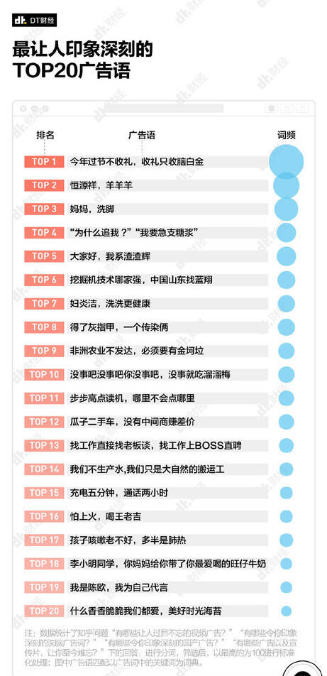7月7日,DT财经通过采集知乎上“有哪些让人过目不忘的视频广告?” “有哪些令你印象深刻的广告词?” “有哪些令你印象深刻的国产广告?”和“有哪些广告及宣传片,让你至今难忘?”等问题下的答案,列出了“最让人深刻的TOP 20广告语”。