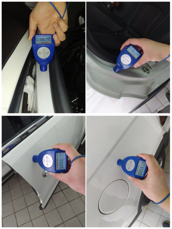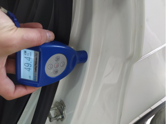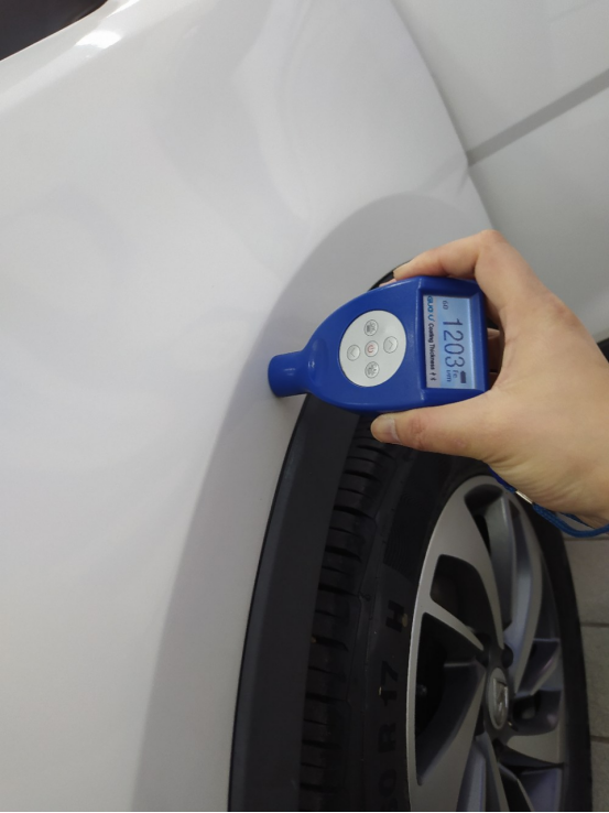 这台车的正常漆面数值在120左右,左前翼子板1200多,比正常的多十倍有余,这是刮过腻子的体现,除此之外,机舱盖、车顶、右前翼子板漆面正常且无拆卸修复痕迹。